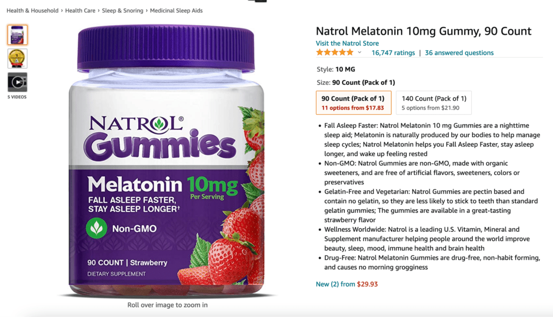 According to Exploding Topics, melatonin gummies have seen 1925% growth in search volume over the past five years, with 85K monthly Google searches. Data also shows 23K monthly Amazon searches.
