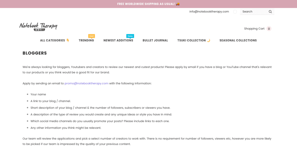 Notebook Therapy is a popular Shopify store that sells notebooks, pens and pencils, washi tape, stencils, stickers, and backpacks. The shipping policy isn’t the only giveaway that this is a dropshipping store.